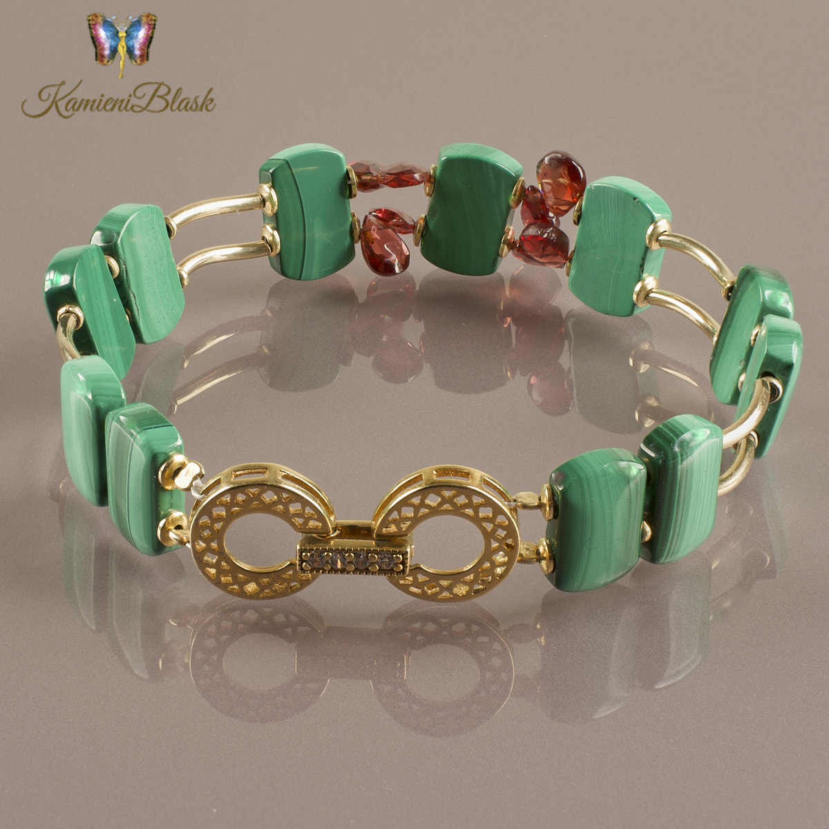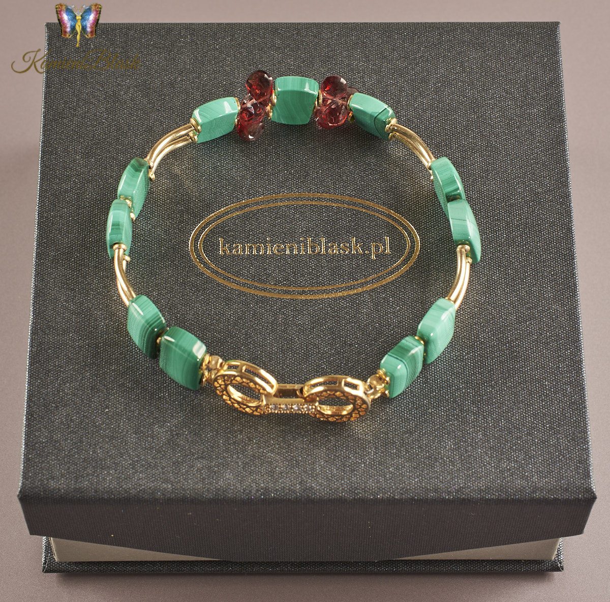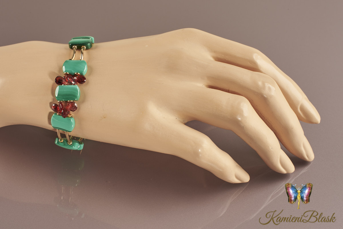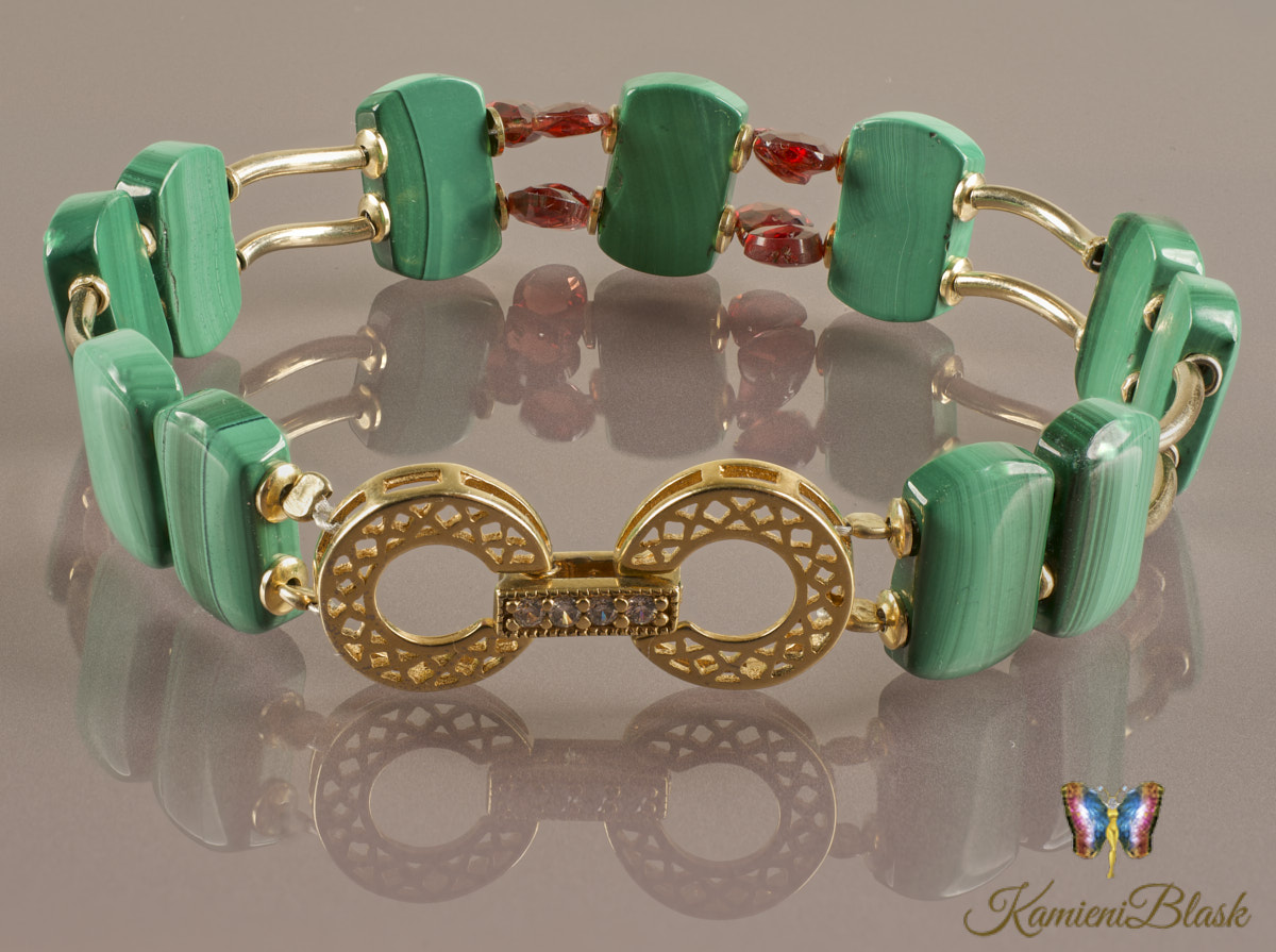 Bransoletka z malachitów i łezek granatu jest ozdobą, której nie sposób pominąć wzrokiem. Ma zdecydowane kolory, jest pełna światła i blasku i napewno pięknie będzie wyglądać do wielu stylizacji.