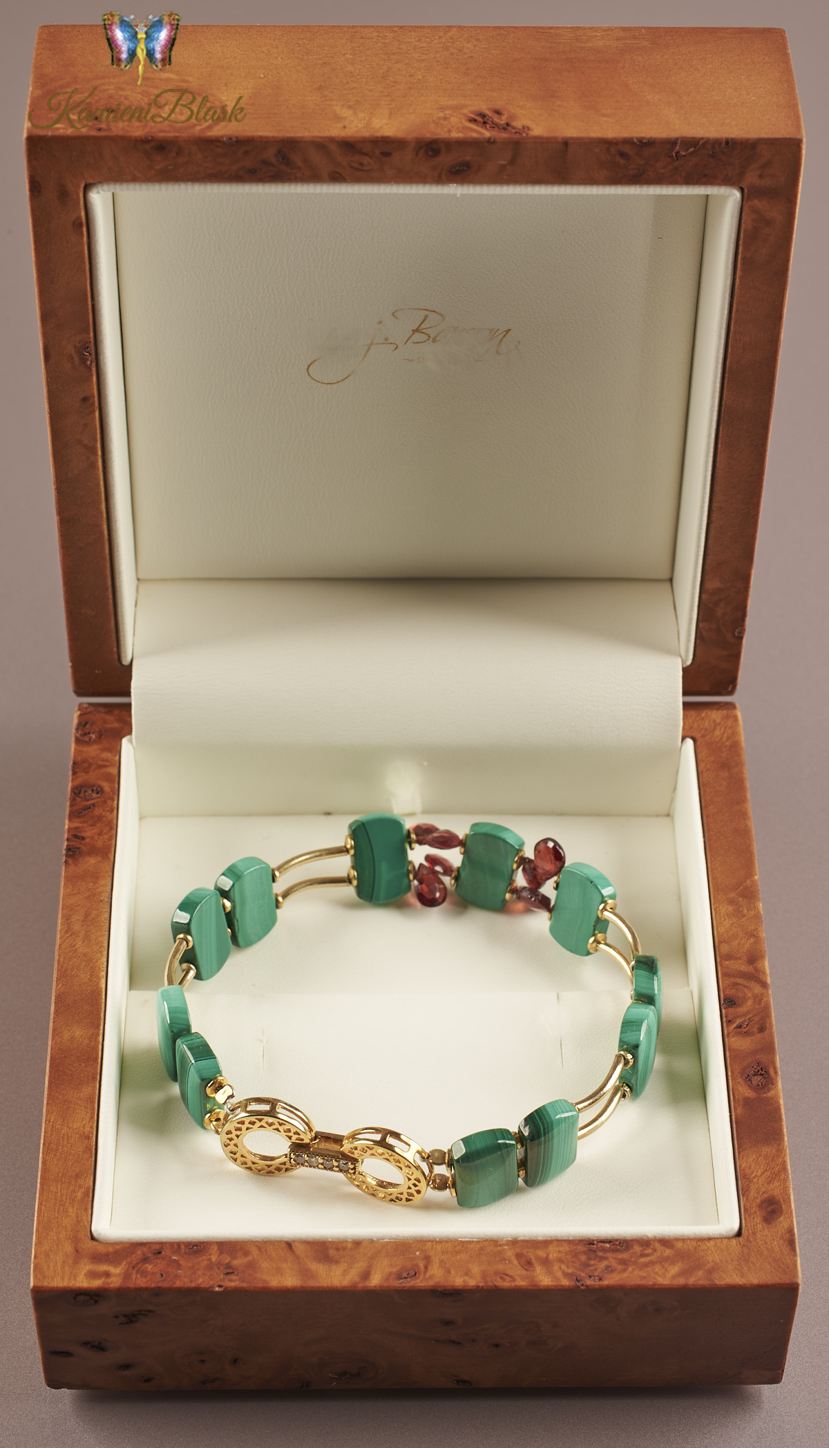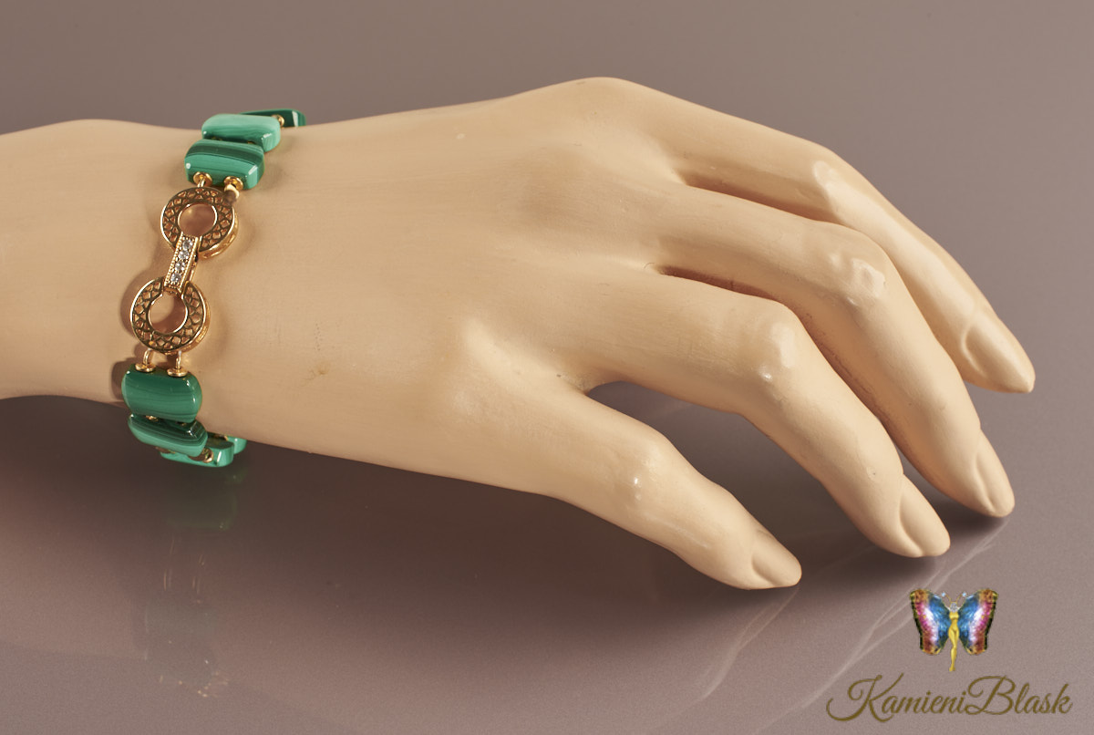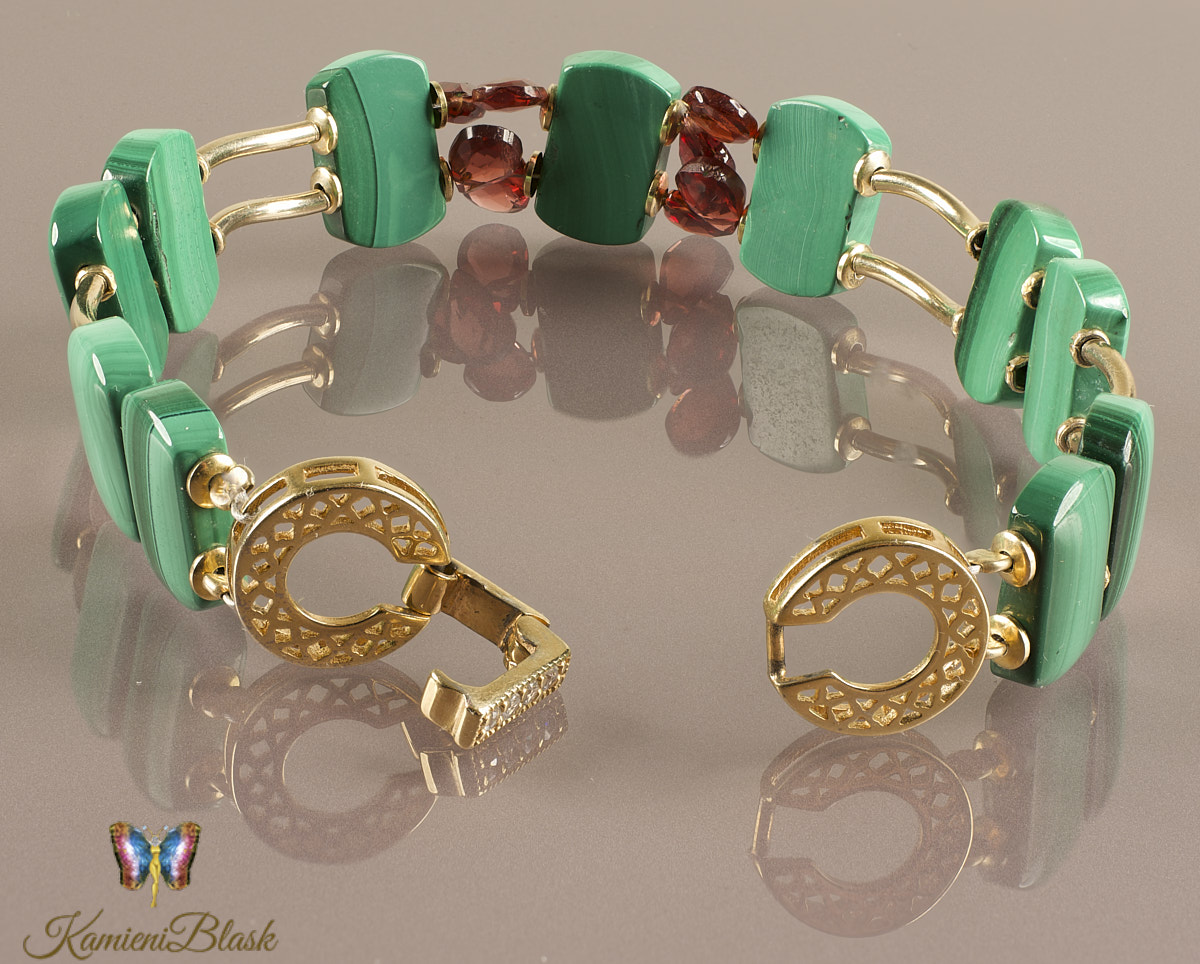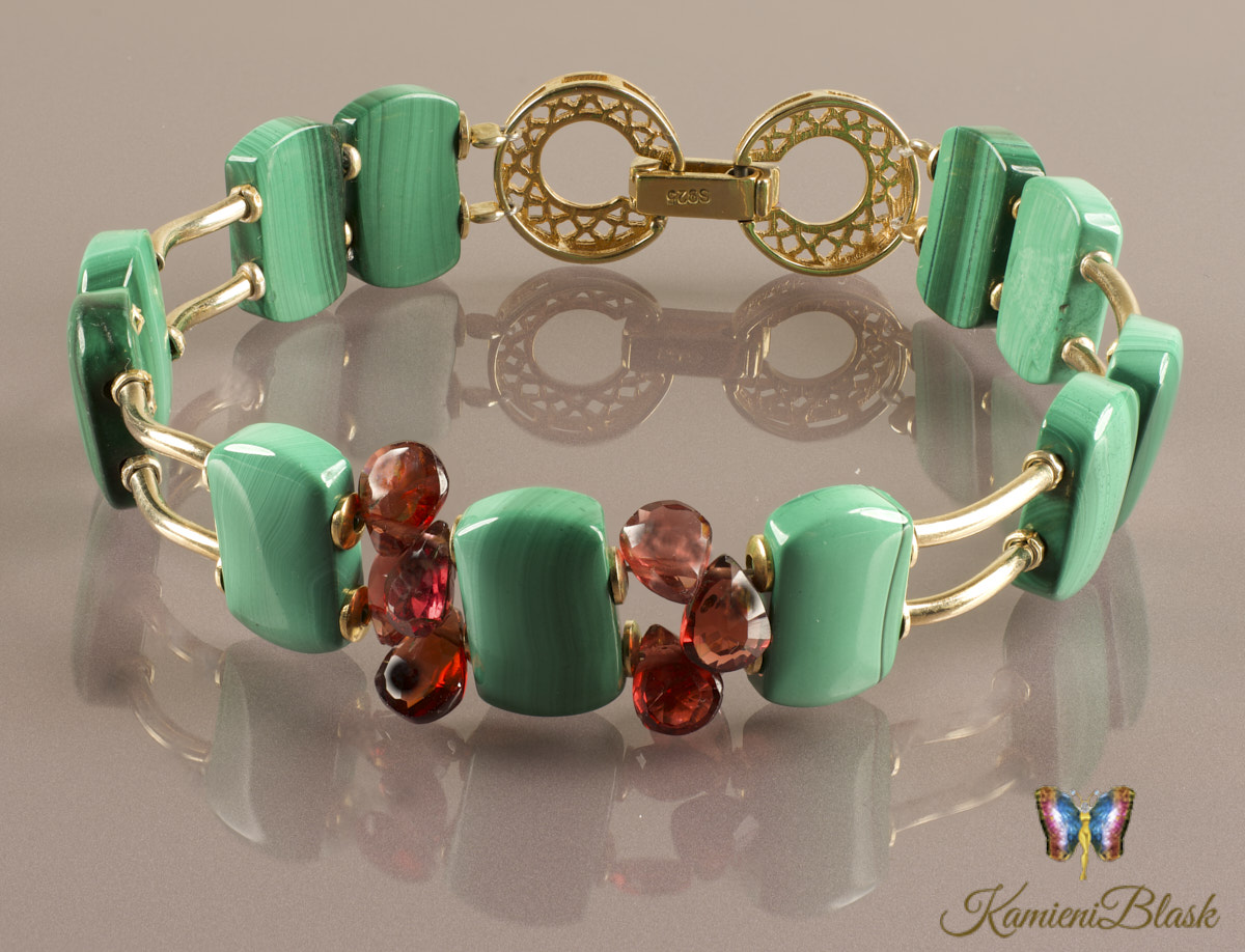 Bransoletka z malachitów i łezek granatu jest ozdobą, której nie sposób pominąć wzrokiem. Ma zdecydowane kolory, jest pełna światła i blasku i napewno pięknie będzie wyglądać do wielu stylizacji.